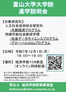 2025年11月19日 富山大学大学院 人文社会芸術総合研究科 進学説明会(共創経済プログラム)の開催について(令和7年12月1日(月)開催) オンライン参加申込用フォームのURL: https://forms.office.com/r/pxLn4ejkbX (共創経済)R8富山大学大学院人文社会芸術総合研究科進学説明会ポスター(2次)